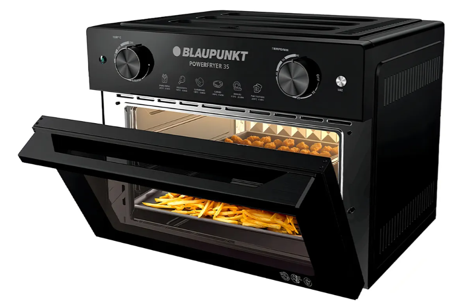 Horno de Aire Freidora Sin Aceite BLAUPUNKT Power Fryer 35 2000W 35Lts con 6 Funciones y 4 Bandejas Freidora Sin Aceite por Aire Caliente tipo Horno BLAUPUNKT POWER FRYER 35 – Control Frontal, Práctico, 35L de Capacidad y Potencia 1700-2000W con múltiples posiciones de Cocción, 4 Bandejas accesorias y 6 Funciones: Freír, Calentar, Asar, Descongelar, Tostar y Deshidratar. BLAUPUNKT POWER FRYER 35 – FREIDORA DE AIRE SIN ACEITE tipo HORNO – DISEÑO 100% METÁLICO – GRAN CAPACIDAD FAMILIAR de 35 Lts – 6 FUNCIONES: FREÍR, CALENTAR, ASAR, DESCONGELAR, TOSTAR Y DESHIDRATAR. – 99% MENOS ACEITE – 4 POSICIONES DE COCCIÓN – INTERIOR REVESTIDO ANTIADHERENTE – MANIJA FRÍA AL TACTO – LUZ DE ENCENDIDO – LUZ INTERIOR – AHORRO DE ENERGÍA – APAGADO AUTOMÁTICO CARACTERÍSTICAS: – Potencia: 1700 – 2000W – Alimentación: 220 V ~ 50 Hz – Temperatura ajustable: 90°C -230°C – Capacidad: 35L – Temporizador: 60 minutos – Interior de chapa galvanizada – Medidas: 455 x 430 x 368 mm – Peso: 12Kg INCLUYE 4 ACCESORIOS PARA PREPARAR TUS COMIDAS: – BANDEJA PARA ASAR – BANDEJA PARA MIGAS – BANDEJA TIPO PARRILLA – BANDEJA PARA FR