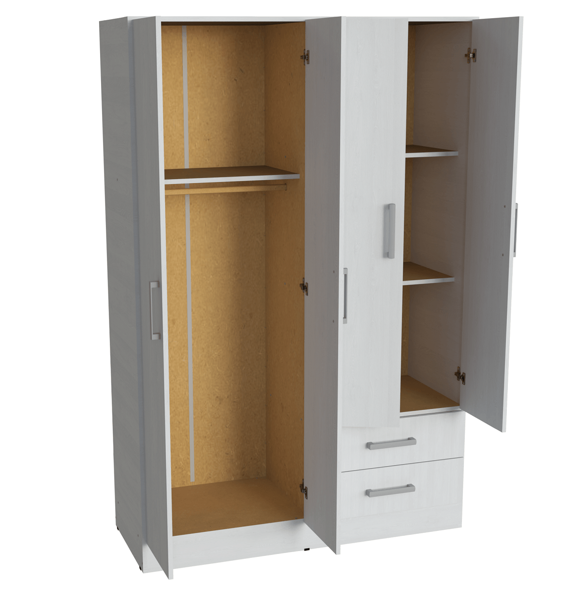 Con un amplio espacio de almacenamiento distribuido en estantes y un práctico sector de colgado, este modelo de 4 puertas es perfecto para acomodar ropa, accesorios y objetos personales. Además, incluye manijas ergonómicas que facilitan su uso diario y una estructura robusta que garantiza su durabilidad. El ensamblaje es sencillo e incluye un manual detallado para que lo armes fácilmente en casa.