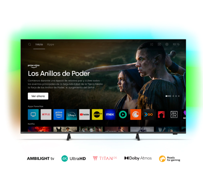 Disfrute su tiempo libre en un nivel totalmente nuevo con el televisor Ambilight. Este televisor Ambilight lo sumerge en cada programa, película y juego. Obtendrá una calidad de imagen fascinante, todas las aplicaciones de transmisión imprescindibles y un soporte que se ajusta fácilmente para admitir una barra de sonido.